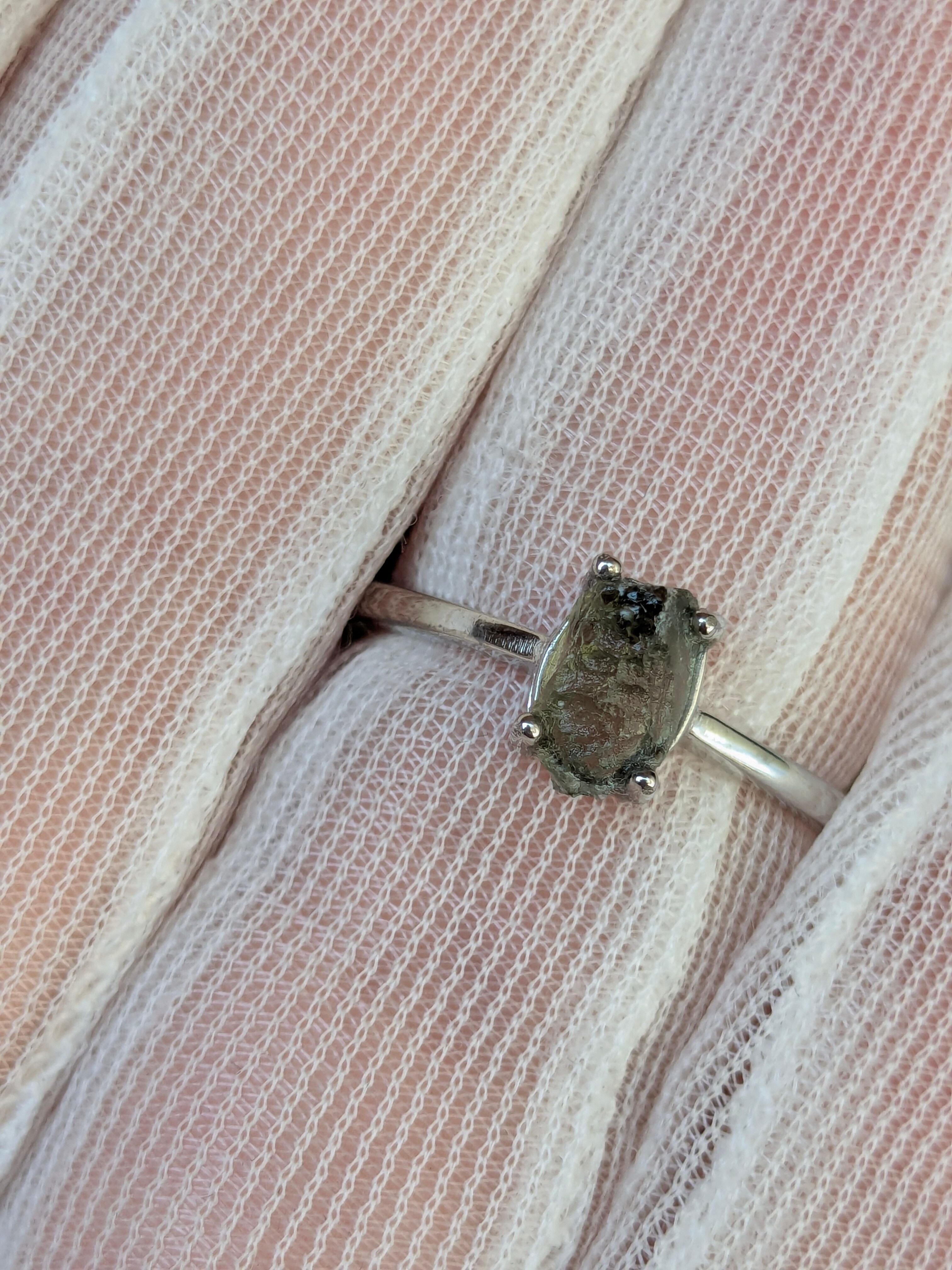 モルダバイトは、隕石衝突の際にとけた鉱物が固まった天然ガラスであるテクタイトの1種です。 ネルトリンガー・リースと呼ばれる巨大なクレーターがドイツに残っており、その隕石衝突の際に形成されたとされたといわれています。 モルダウ川上流付近で発見されることが、名前の由来となっています。 テクタイトは他でも産出されますが、モルダバイトは他では見られない森の深緑を思わせるキレイなグリーン色が特徴です。